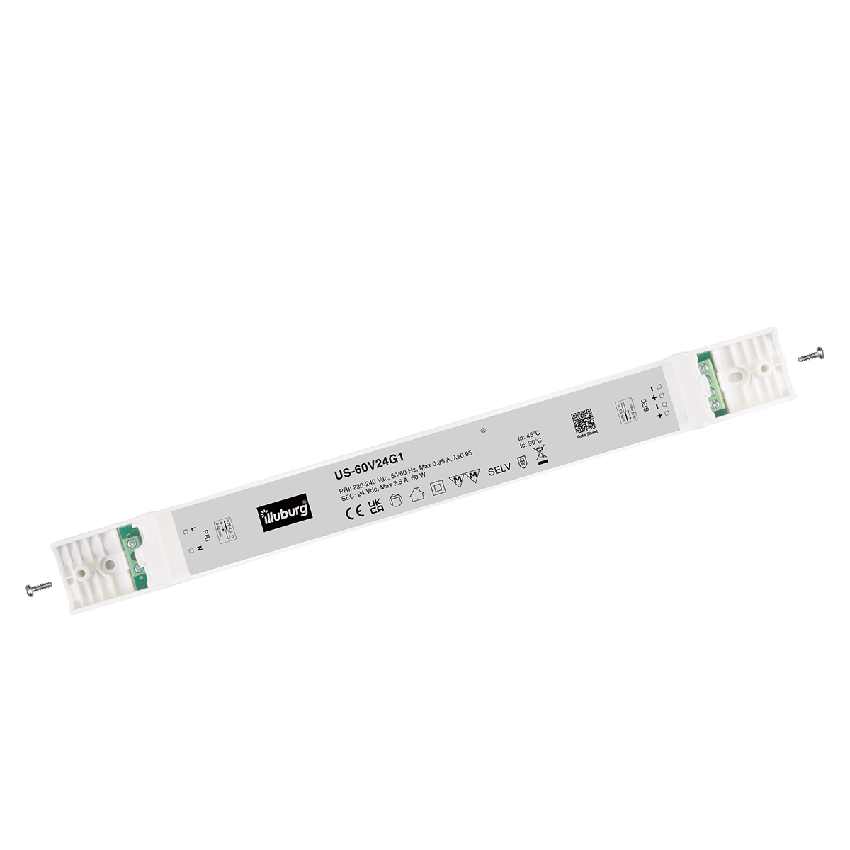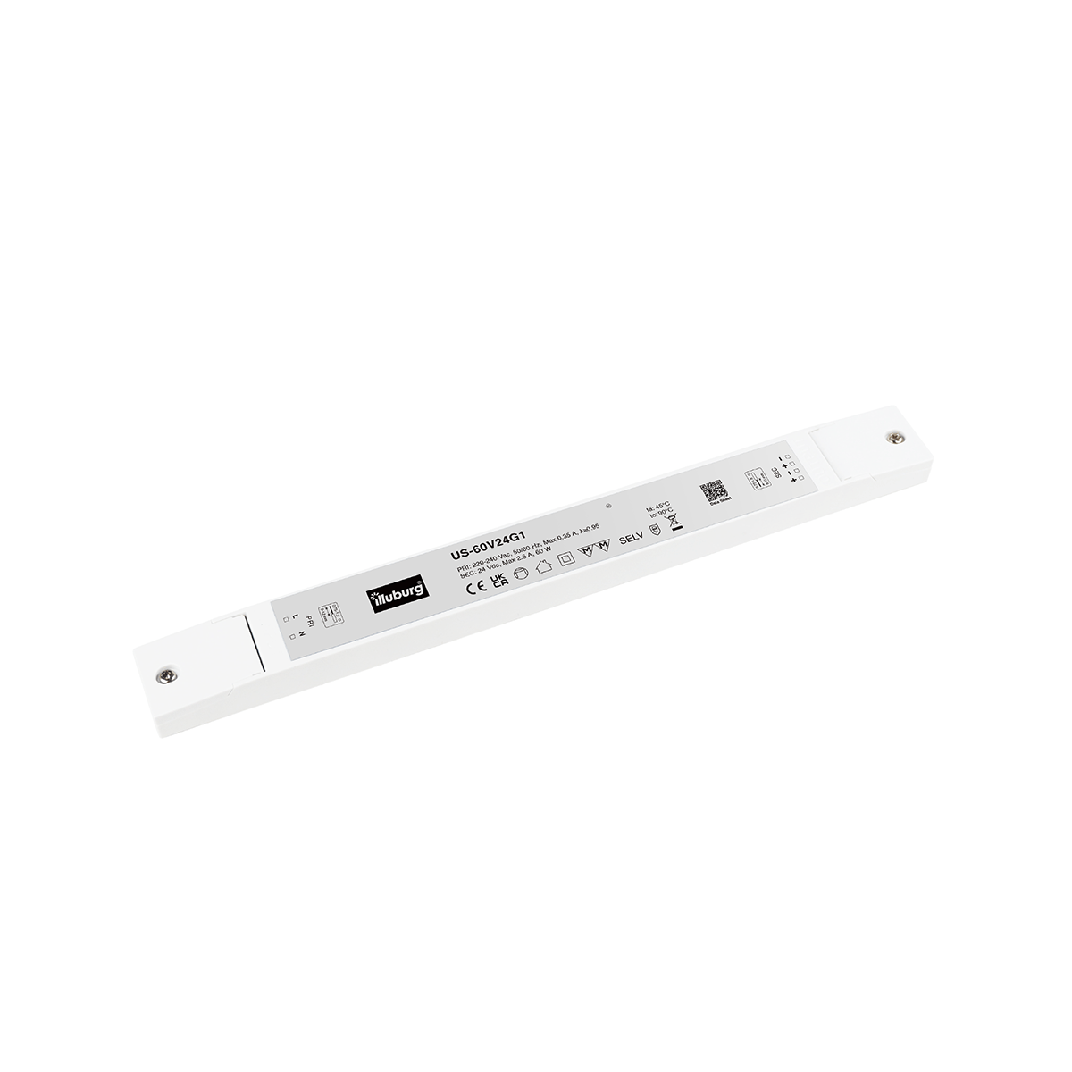 LED power supply US-60V24G1: LED transformer constant voltage, input 220 – 240 V (AC), output 24 V (DC), non-dimmable, independent installation.