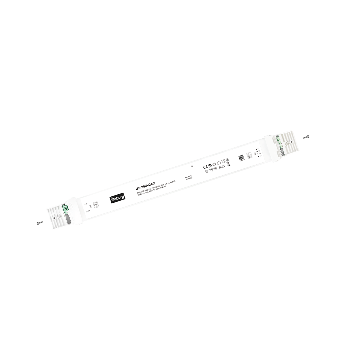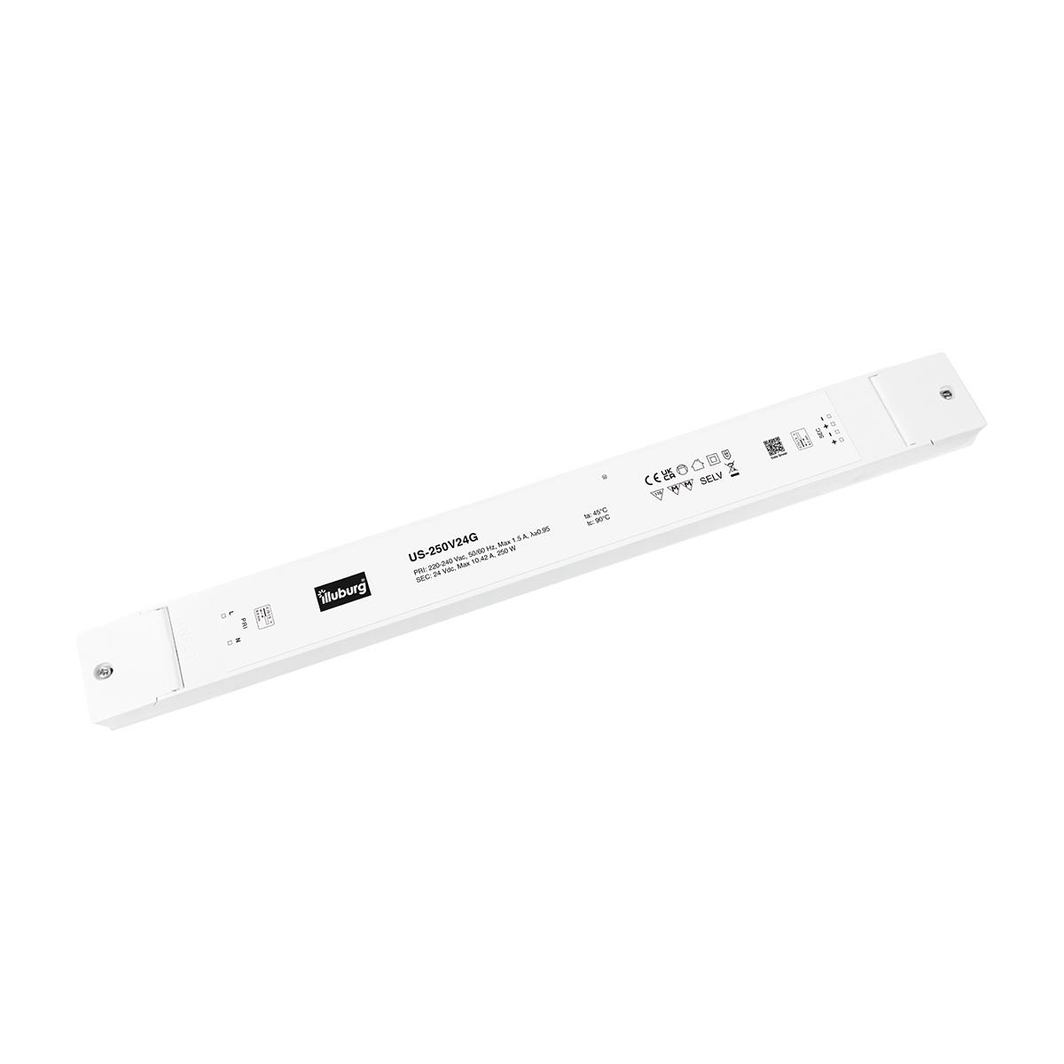 LED power supply US-250V24G: LED transformer constant voltage, input 220 – 240 V (AC), output 24 V (DC), non-dimmable, flicker-free, independent installation.