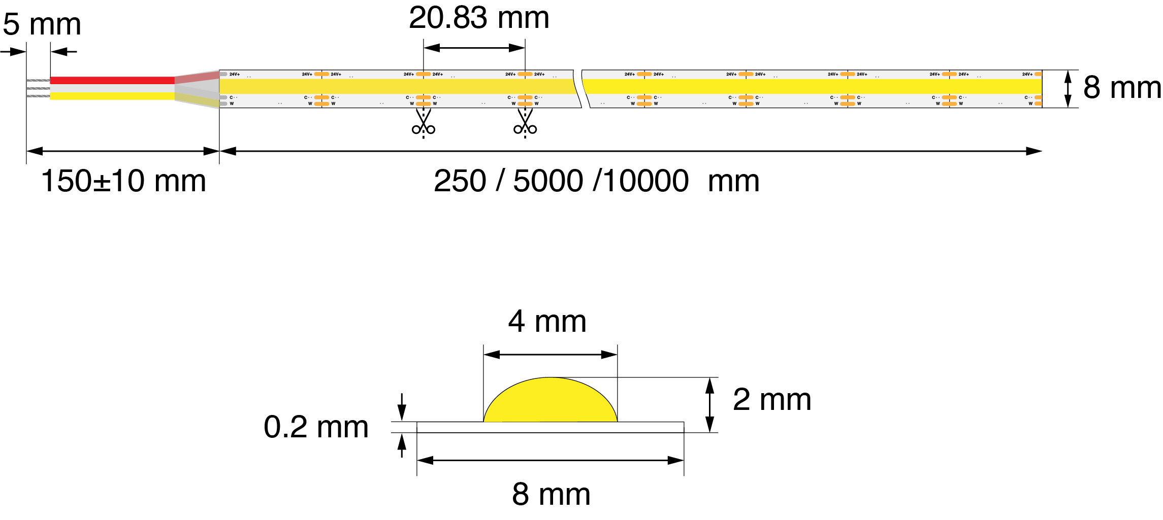 INSTALLATION: Width 8 mm, height 2 mm, easy to cut with a section length of 20.8 mm (12 LEDs each), protection class IP20.