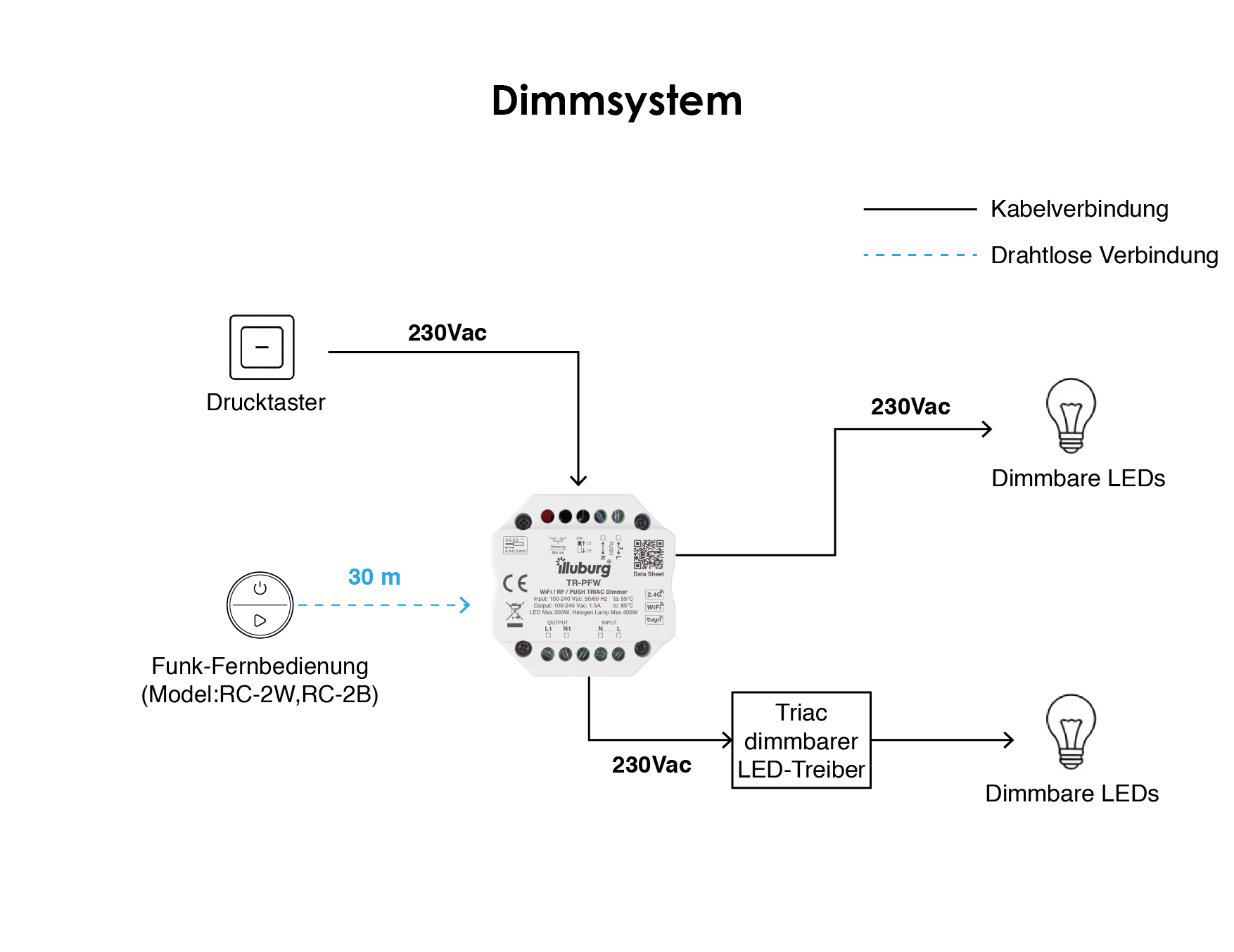 PUSH-DIMMEN: mit einem Taster (primär) kann man mehrere Dimmer TR-PF regulieren und synchronisieren, Ein- und Ausschalten mit Memory-Funktion.
