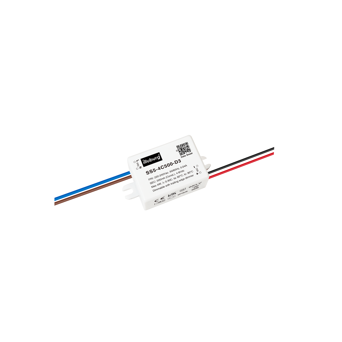 LED-TREIBER SS5-4C500-D3: Eingang 220 – 240 V (AC), Ausgang 500mA Konstantstrom mit Spannungsbereich 4 – 8 V (DC), dimmbar, Einbau-Installation.