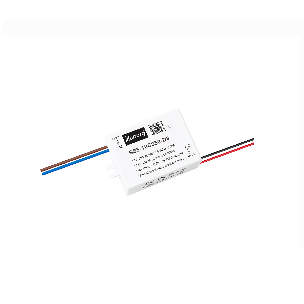 LED-TREIBER SS5-10C350-D3: Eingang 220 – 240 V (AC), Ausgang 350mA Konstantstrom mit Spannungsbereich 14 – 29 V (DC), dimmbar, Einbau-Installation.