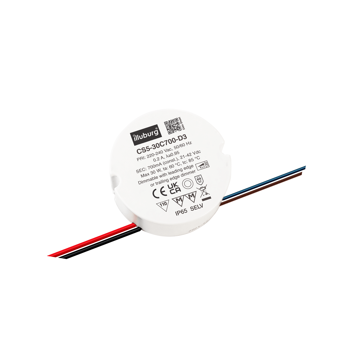 LED-TREIBER CS5-30C700-D3: Eingang 220 – 240 V (AC), Ausgang 700mA Konstantstrom mit Spannungsbereich 21 – 42 V (DC), dimmbar, Einbau-Installation.