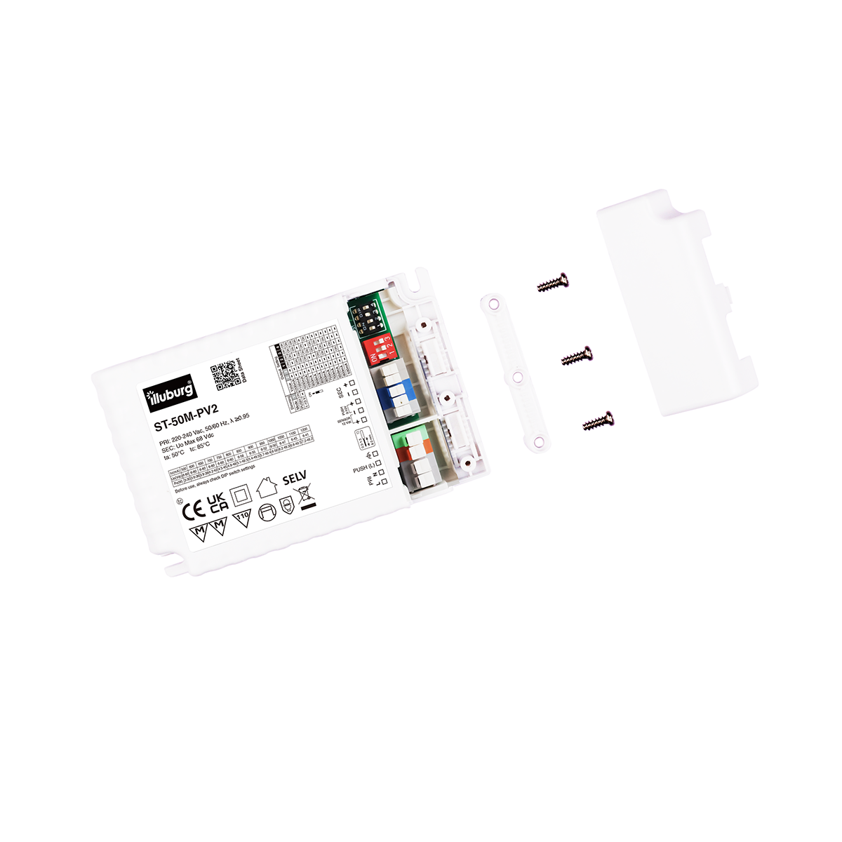 Montage: Schutzart IP20, Abmessung 123 x 79 x 24 mm (L x B x H), Umgebungstemperatur (ta) -25 – +50 °C, Max. Oberflächentemperatur (tc) 85°C. Einfacher Anschluss durch Federzugklemmen.
