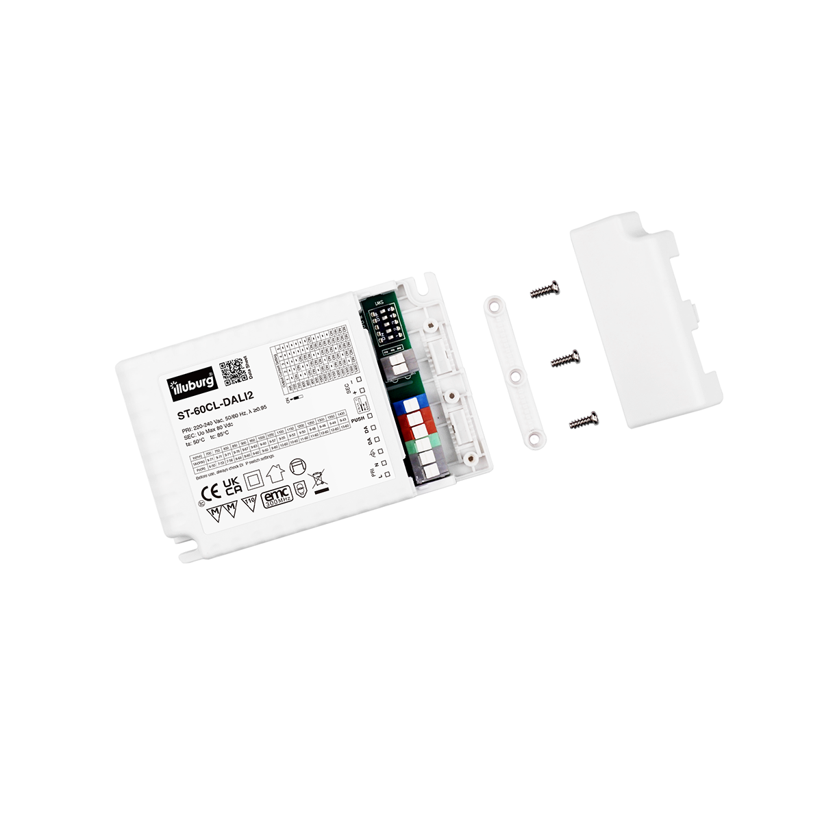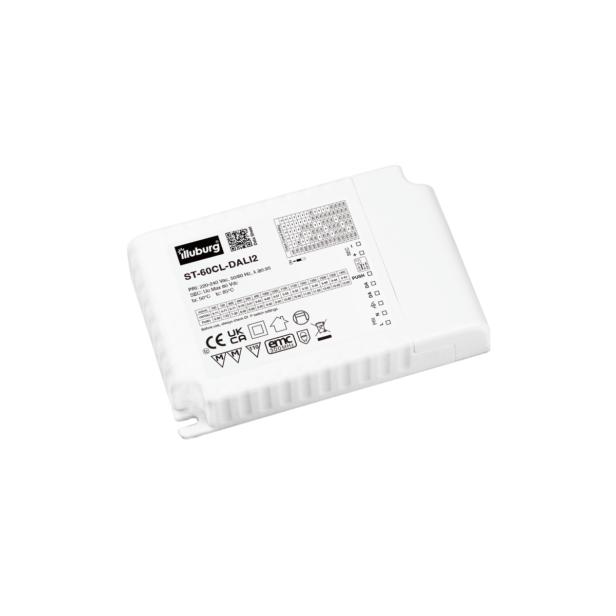 LED-Netzteil ST-60M-DALI2: LED Trafo mit einstellbarem Ausgang, Eingang 220 – 240 V (AC), DALI-2, Taster (PUSH, primär) dimmbar, flackerfrei, unabhängige Installation.