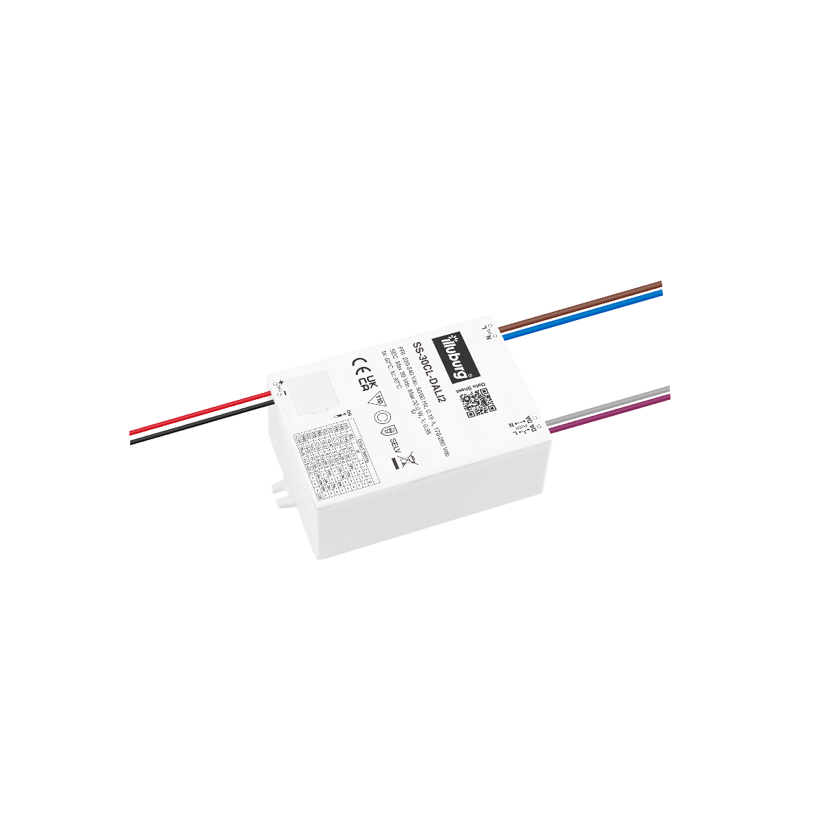 LED-TREIBER SS-30CL-DALI2: Eingang 220 – 240 V (AC), Ausgang 500 – 1050 mA Kosntantstrom, dimmbar, Einbau-Installation.