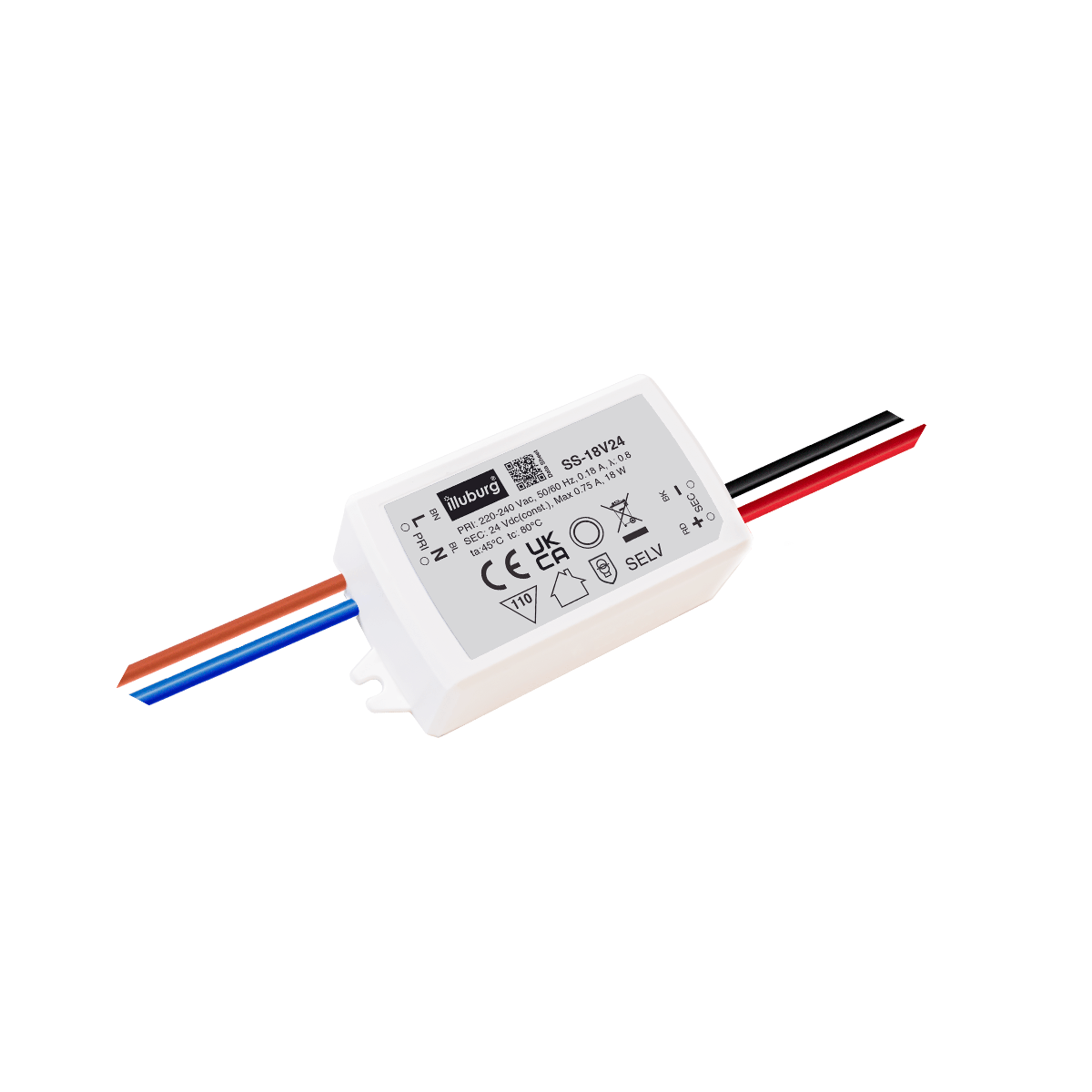 LED-TREIBER SS-18V24: Eingang 220 – 240 V (AC), Ausgang 24 V (DC) Konstantpannung, nicht dimmbar, Einbau-Installation.