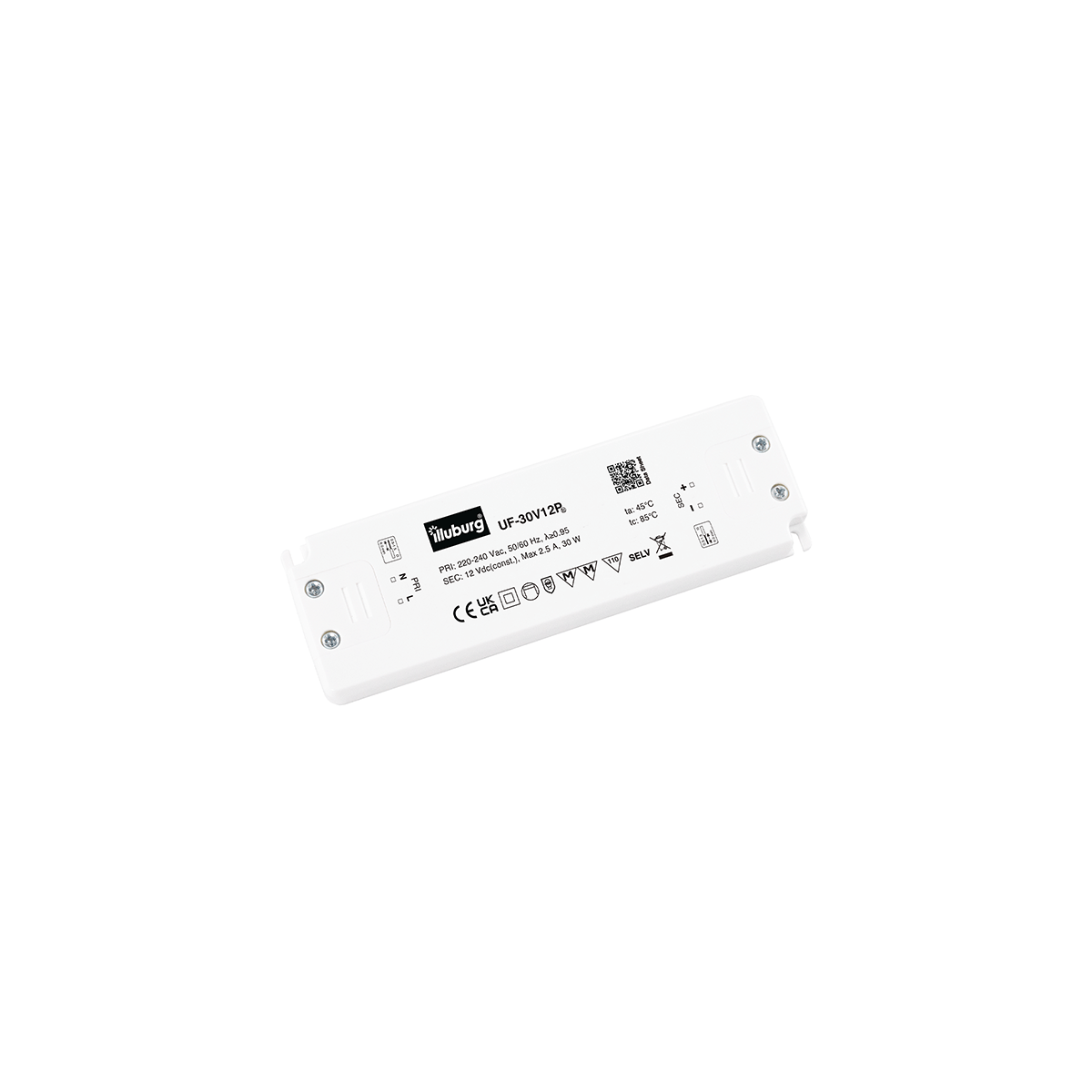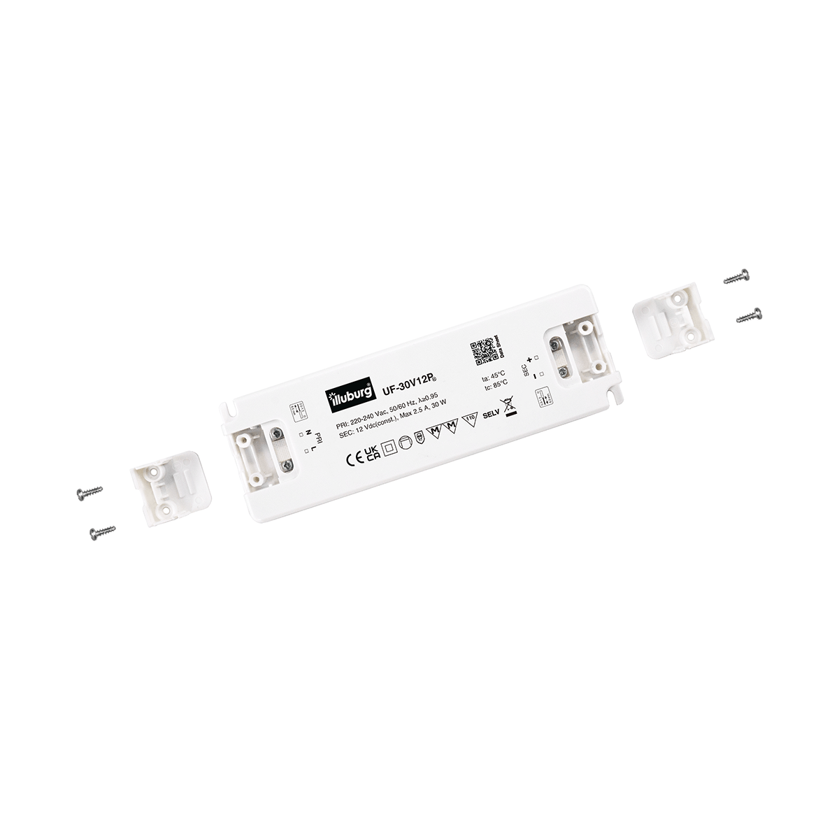 LED-Netzteil UF-30V12: LED Trafo Konstantpannung, Eingang 220 – 240 V (AC), Ausgang 12 V (DC), nicht dimmbar, flackerfrei, unabhängige Installation.