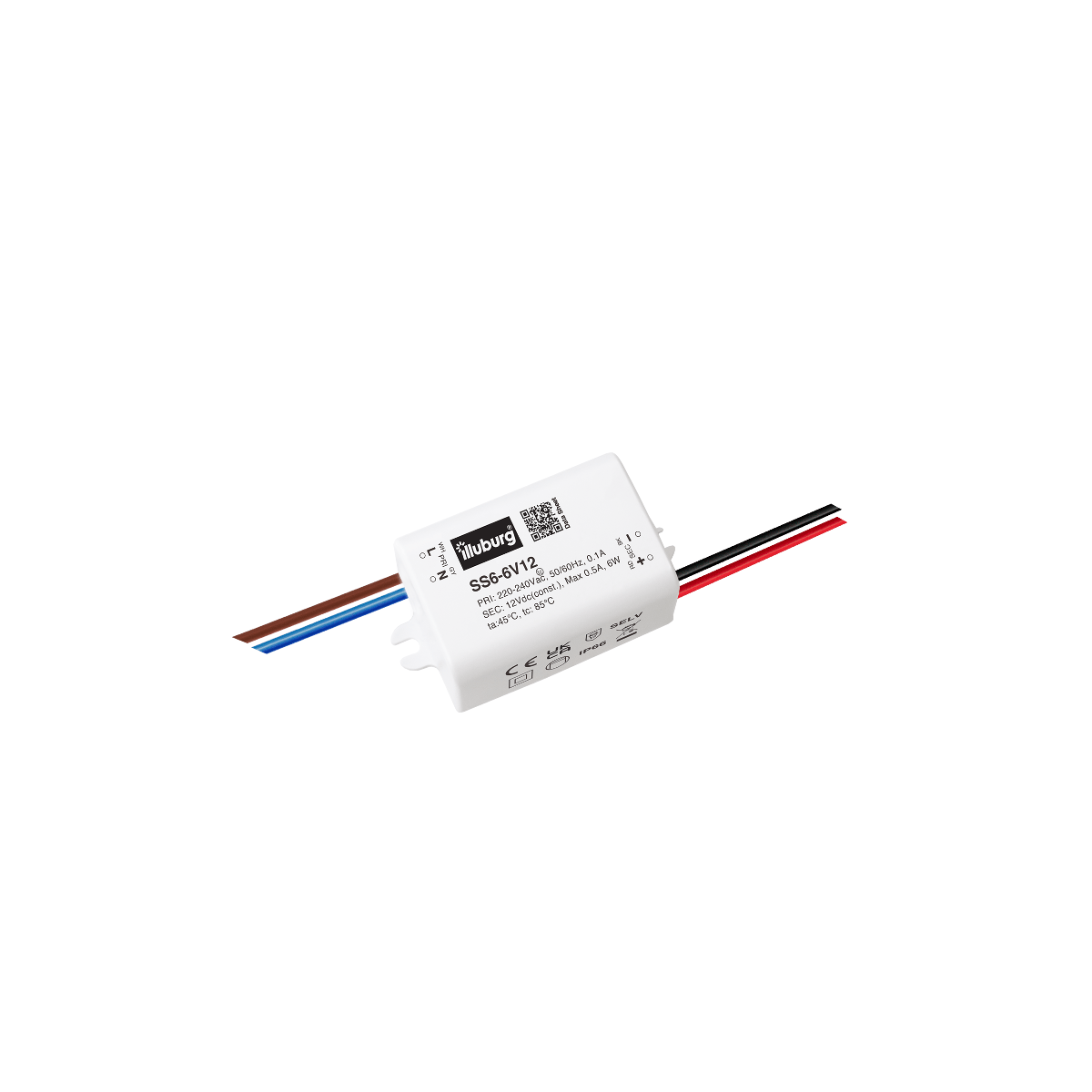 LED-Netzteil SS6-6V12: LED Trafo Konstantpannung, Eingang 198 – 264 V (AC), Ausgang 12 V (DC), nicht dimmbar, Einbau-Installation.