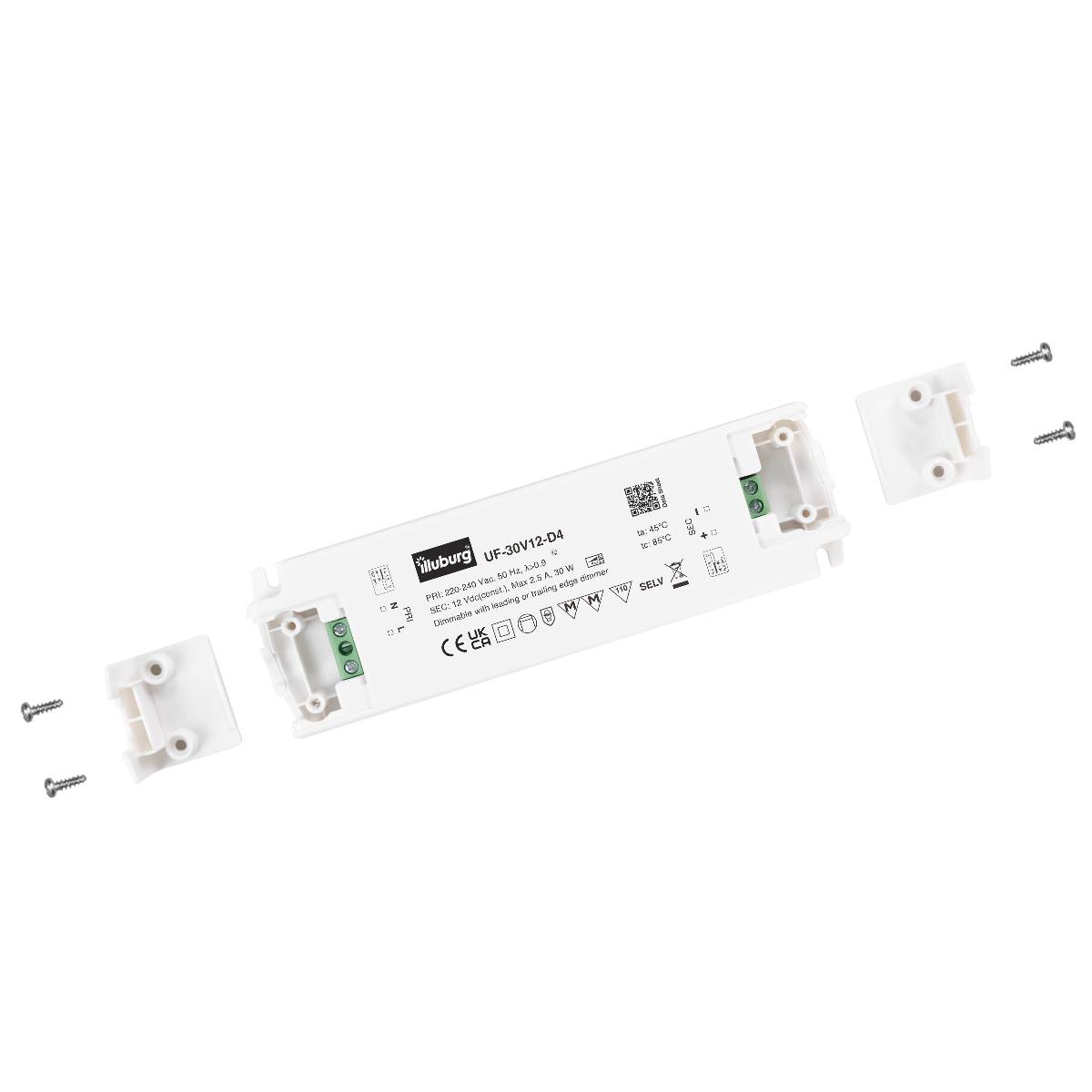 LED-TREIBER UF-30V12-D4: Eingang 220 – 240 V (AC), Ausgang 12 V (DC) Konstantpannung, dimmbar, unabhängige Installation, Anschluss durch Schraubklemmen.
