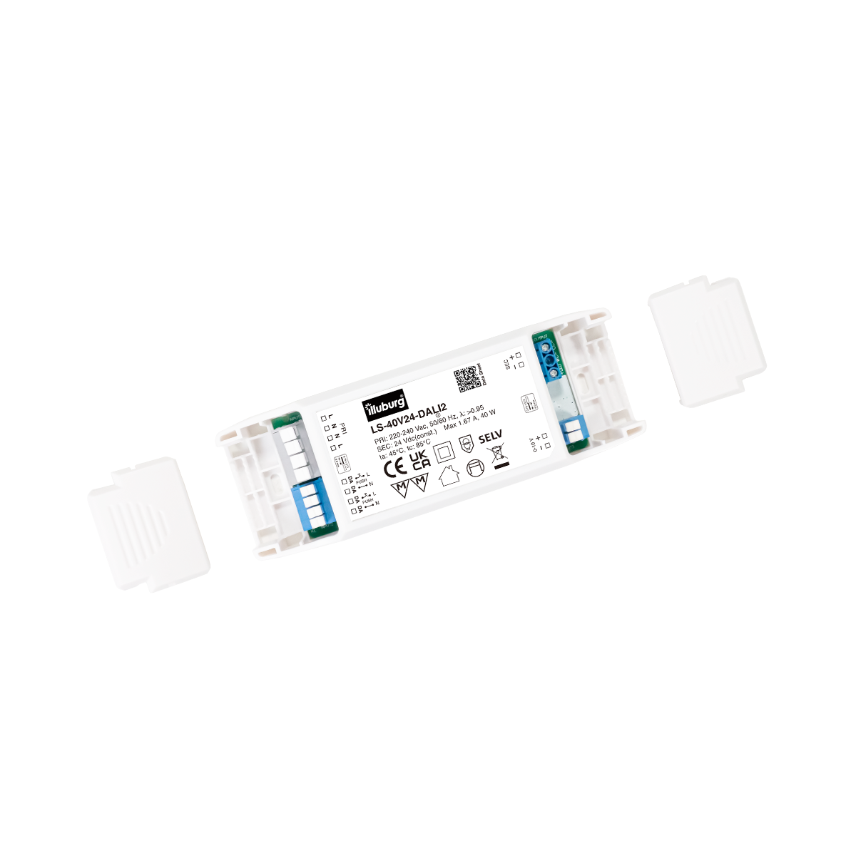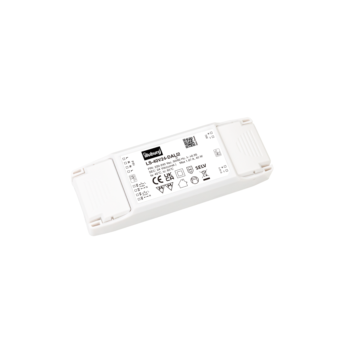 LED-Netzteil LS-40V24-DALI2: LED Trafo Konstantpannung, Eingang 220 – 240 V (AC), Ausgang 24 V (DC), dimmbar mit DALI2, PUSH(pri.), 0-10V (sec.), flackerfrei, unabhängige Installation.