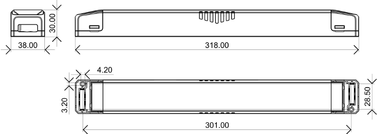 Montage: Schutzart IP20, Abmessung 290 x 45 x 31 mm (L x B x H), Umgebungstemperatur (ta) -20 – +45 °C, Max. Oberflächentemperatur (tc) 85°C. Einfacher Anschluss durch Schraubklemmen.