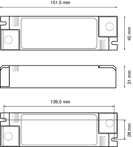 Montage: Schutzart IP20, Abmessung 151 x 40 x 31 mm (L x B x H), Umgebungstemperatur (ta) -20 – +50 °C, Max. Oberflächentemperatur (tc) 85°C. Einfacher Anschluss durch Schraubklemmen.